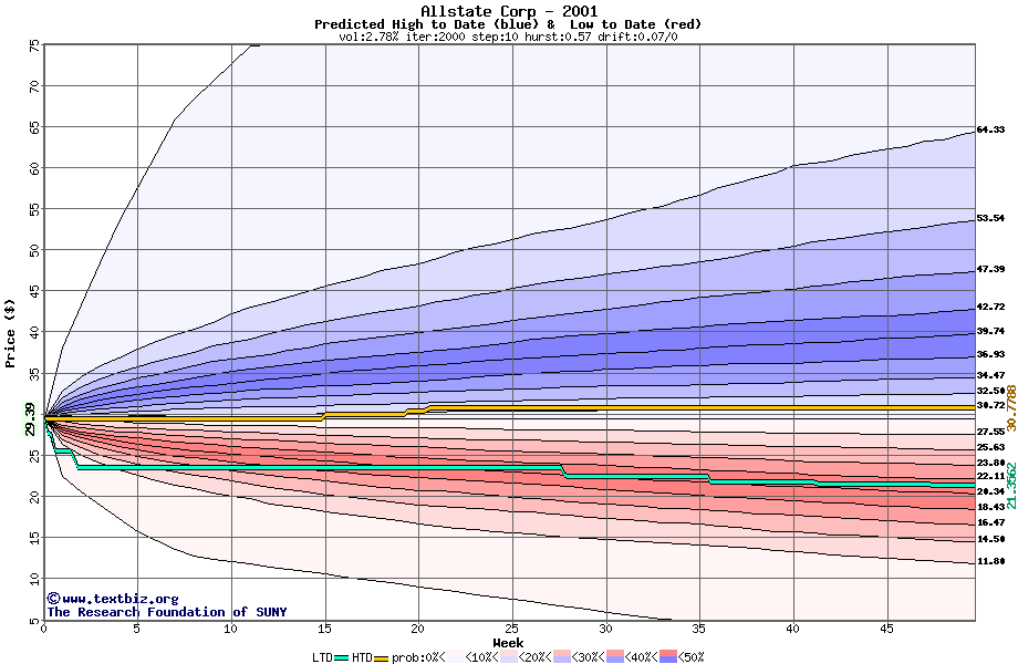 The high to date and low to date prices of the stock plotted against a random walk model for 2001 (what's this?).