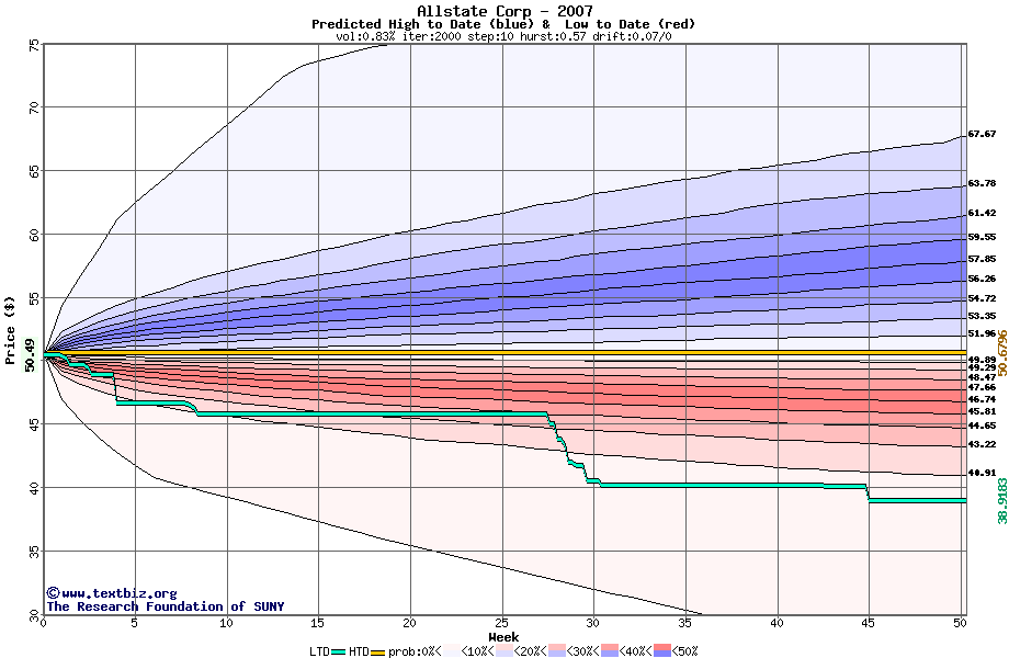 The high to date and low to date prices of the stock plotted against a random walk model for 2007 (what's this?).