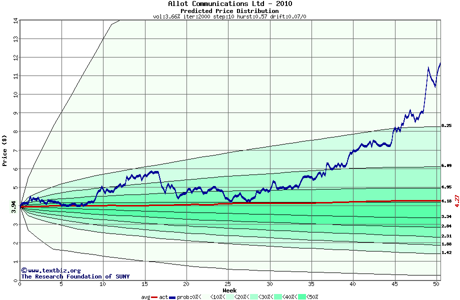 The following graph plots the year-to-date performance of the stock for 2010 compared to the probability calculated by a random walk model.