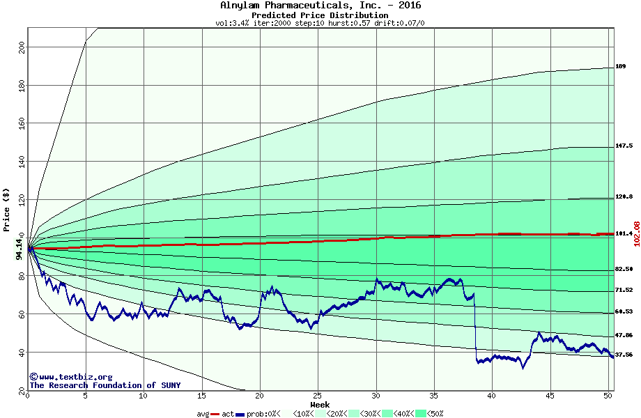 The following graph plots the year-to-date performance of the stock for 2016 compared to the probability calculated by a random walk model.