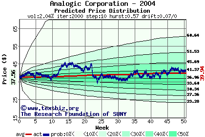 The following graph plots the year-to-date performance of the stock for 2004 compared to the probability calculated by a random walk model.