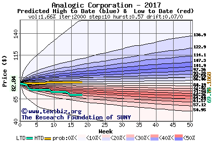 The high to date and low to date prices of the stock plotted against a random walk model for 2017 (what's this?).