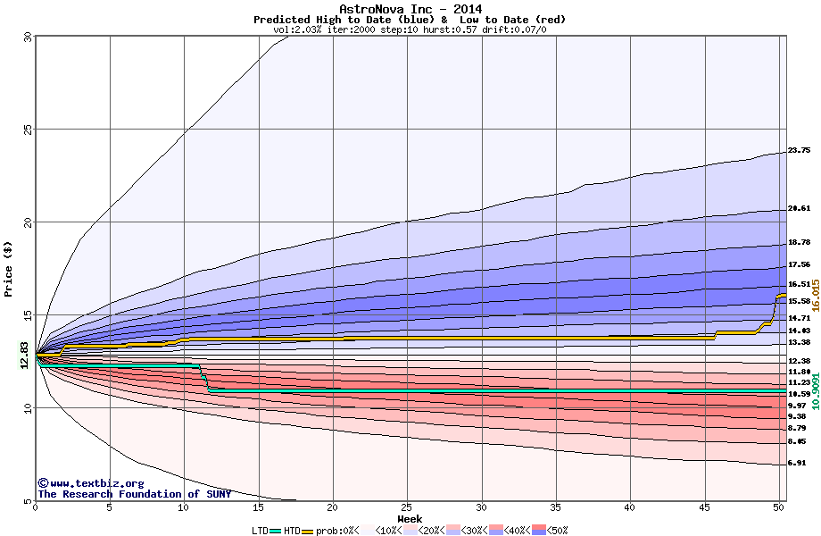 The following graph plots the year-to-date performance of the stock for 2014 compared to the probability calculated by a random walk model.