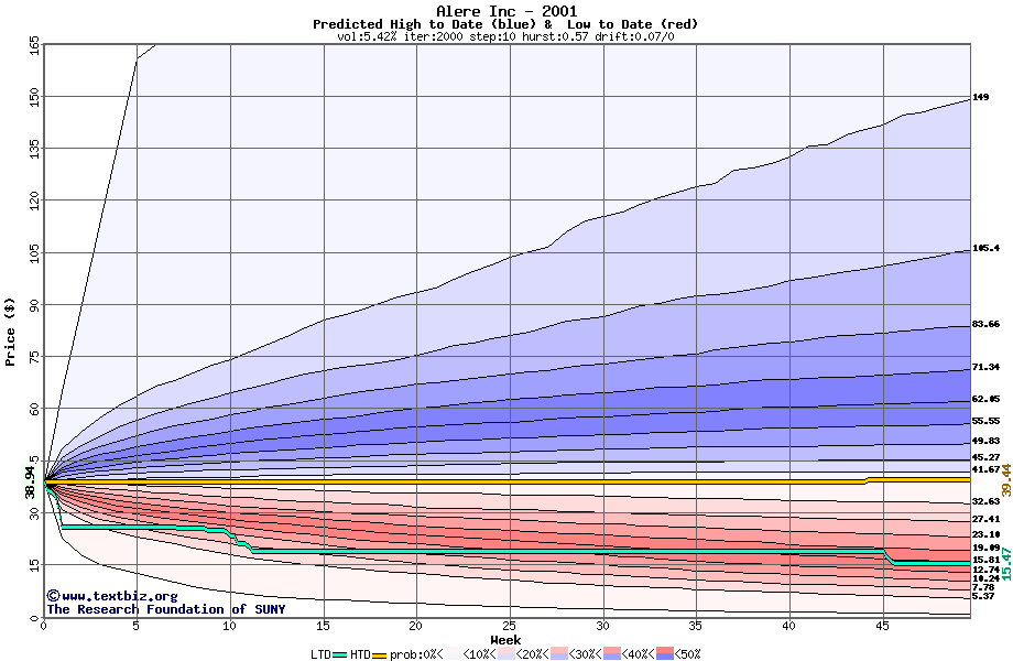 The high to date and low to date prices of the stock plotted against a random walk model for 2001 (what's this?).