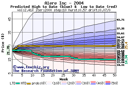 The high to date and low to date prices of the stock plotted against a random walk model for 2004 (what's this?).