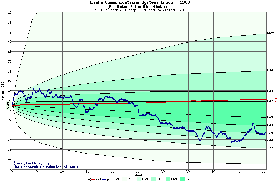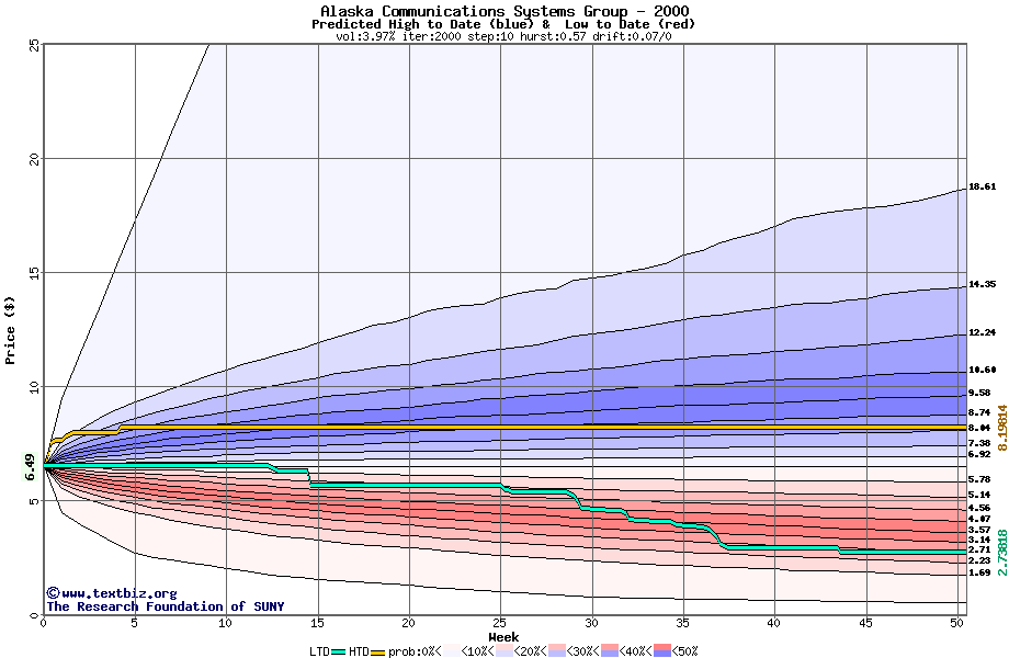 The high to date and low to date prices of the stock plotted against a random walk model for 2000 (what's this?).