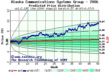 The high to date and low to date prices of the stock plotted against a random walk model for 2006 (what's this?).