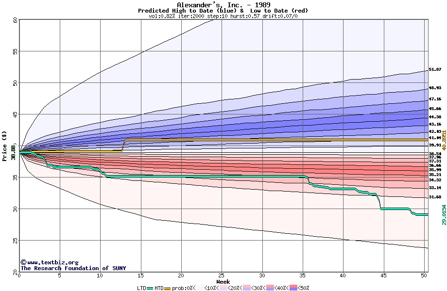 The high to date and low to date prices of the stock plotted against a random walk model for 1989 (what's this?).