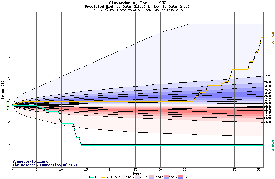 The high to date and low to date prices of the stock plotted against a random walk model for 1992 (what's this?).