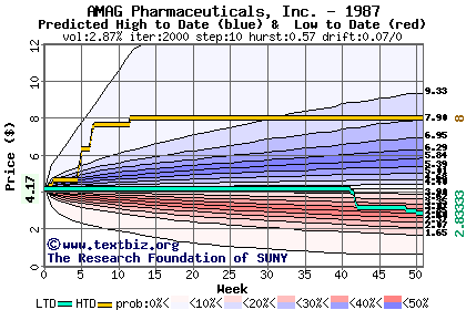 The high to date and low to date prices of the stock plotted against a random walk model for 1987 (what's this?).