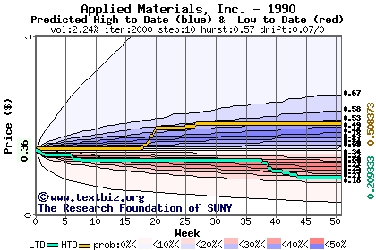 The high to date and low to date prices of the stock plotted against a random walk model for 1990 (what's this?).