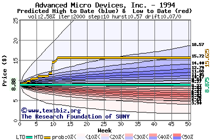 The high to date and low to date prices of the stock plotted against a random walk model for 1994 (what's this?).