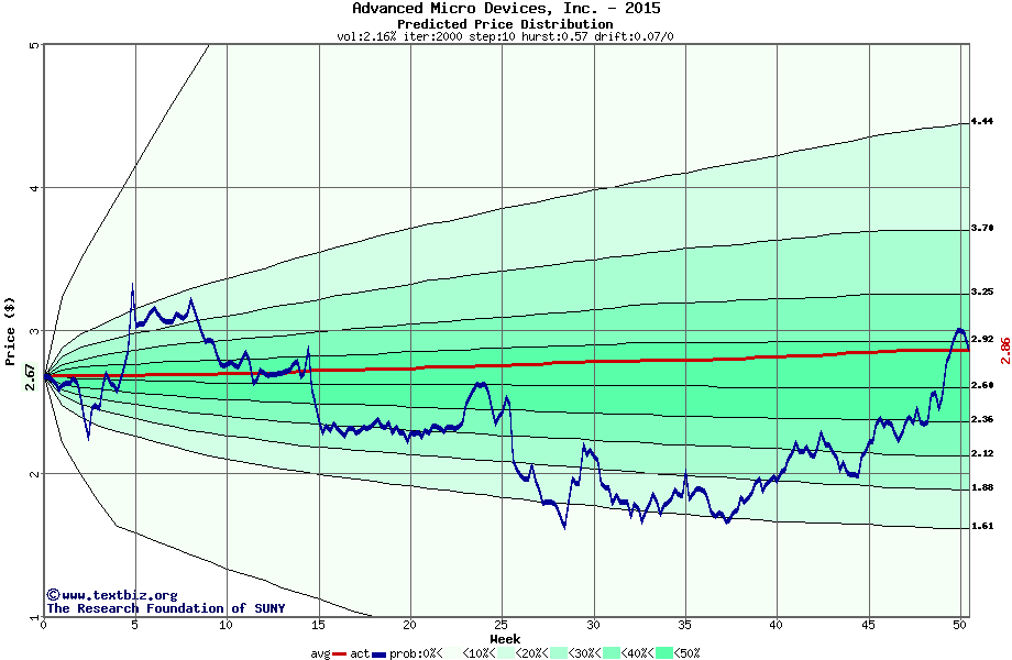 The following graph plots the year-to-date performance of the stock for 2015 compared to the probability calculated by a random walk model.