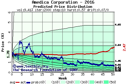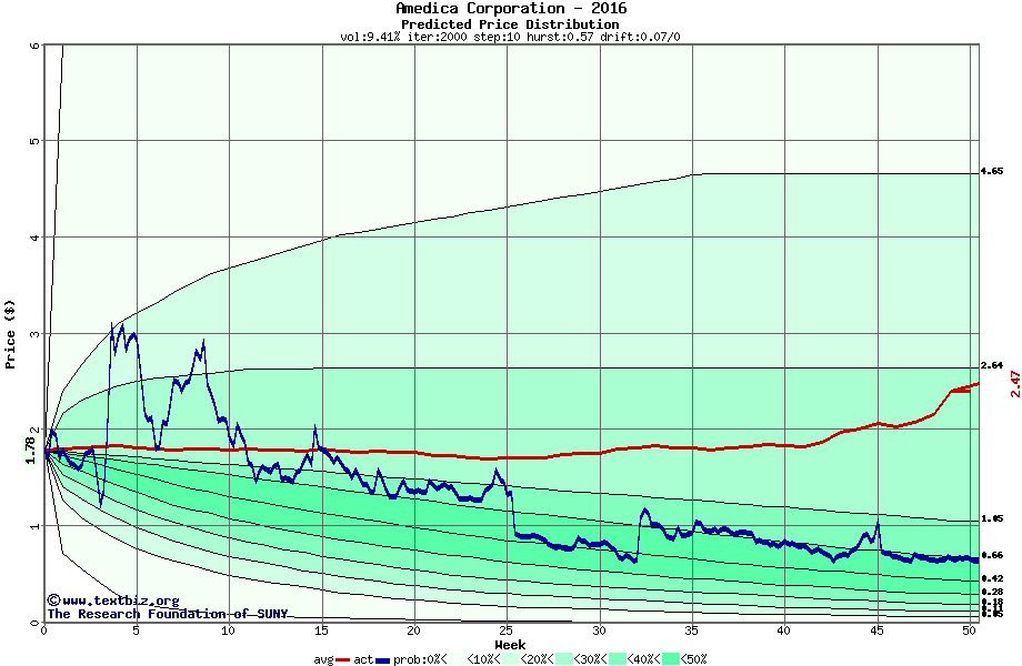 The high to date and low to date prices of the stock plotted against a random walk model for 2016 (what's this?).