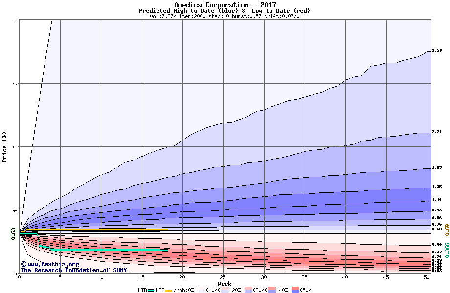 The high to date and low to date prices of the stock plotted against a random walk model for 2017 (what's this?).
