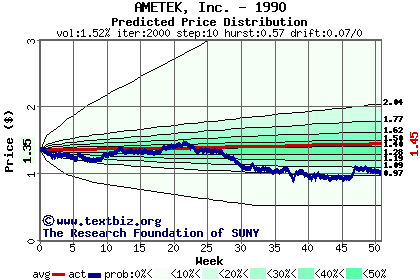 The high to date and low to date prices of the stock plotted against a random walk model for 1990 (what's this?).