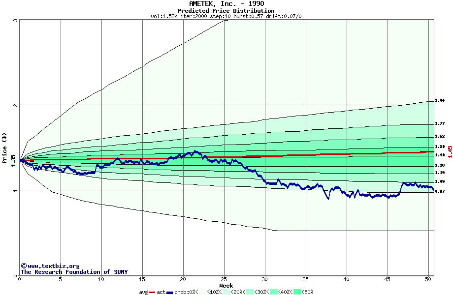 The following graph plots the year-to-date performance of the stock for 1990 compared to the probability calculated by a random walk model.