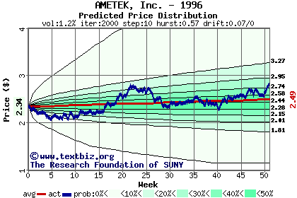 The high to date and low to date prices of the stock plotted against a random walk model for 1996 (what's this?).