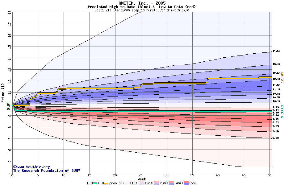 The high to date and low to date prices of the stock plotted against a random walk model for 2005 (what's this?).