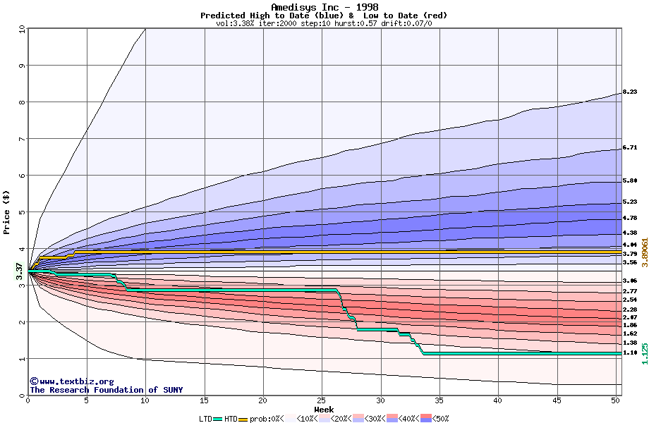 The high to date and low to date prices of the stock plotted against a random walk model for 1998 (what's this?).