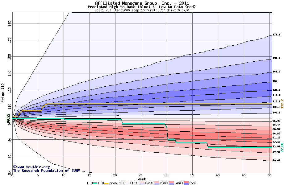 The high to date and low to date prices of the stock plotted against a random walk model for 2011 (what's this?).