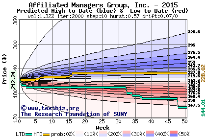 The high to date and low to date prices of the stock plotted against a random walk model for 2015 (what's this?).