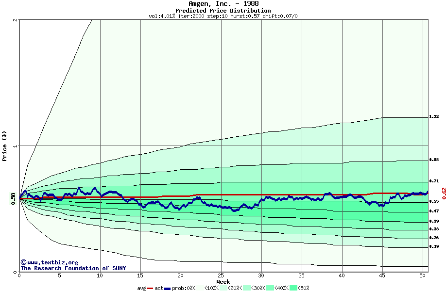 The following graph plots the year-to-date performance of the stock for 1988 compared to the probability calculated by a random walk model.
