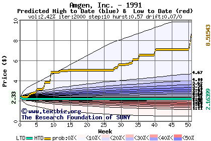 The high to date and low to date prices of the stock plotted against a random walk model for 1991 (what's this?).