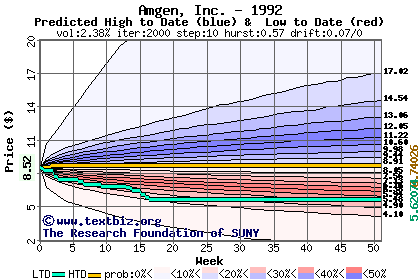 The high to date and low to date prices of the stock plotted against a random walk model for 1992 (what's this?).