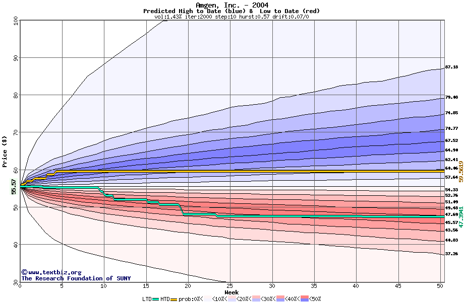 The high to date and low to date prices of the stock plotted against a random walk model for 2004 (what's this?).