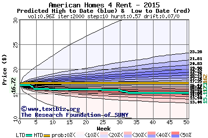 The high to date and low to date prices of the stock plotted against a random walk model for 2015 (what's this?).