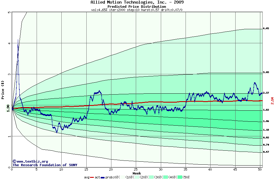 The following graph plots the year-to-date performance of the stock for 2009 compared to the probability calculated by a random walk model.