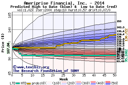 The high to date and low to date prices of the stock plotted against a random walk model for 2014 (what's this?).