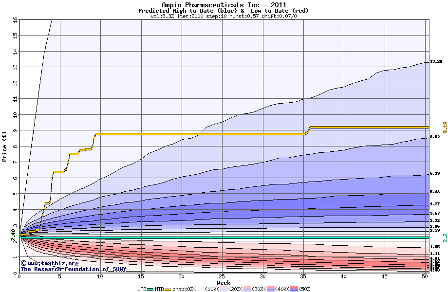 The high to date and low to date prices of the stock plotted against a random walk model for 2011 (what's this?).