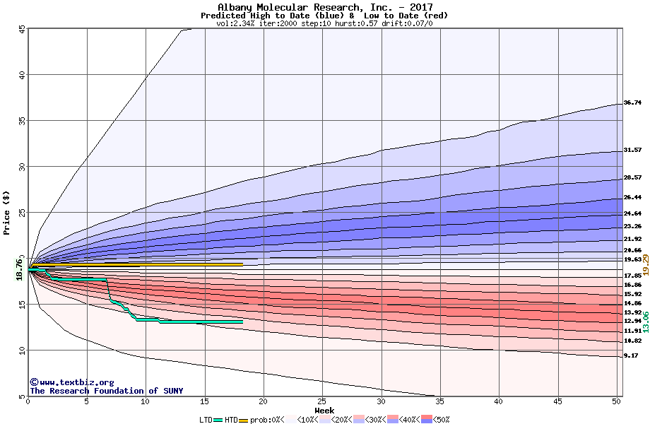 The high to date and low to date prices of the stock plotted against a random walk model for 2017 (what's this?).