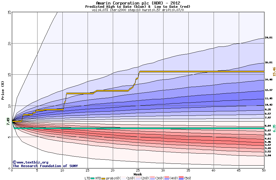 The high to date and low to date prices of the stock plotted against a random walk model for 2012 (what's this?).