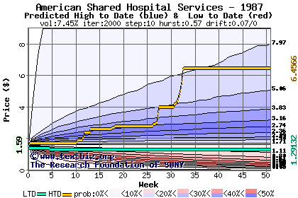 The high to date and low to date prices of the stock plotted against a random walk model for 1987 (what's this?).