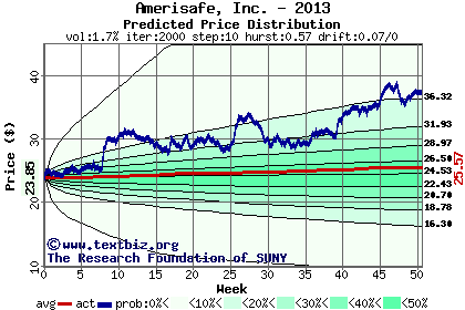 The high to date and low to date prices of the stock plotted against a random walk model for 2013 (what's this?).
