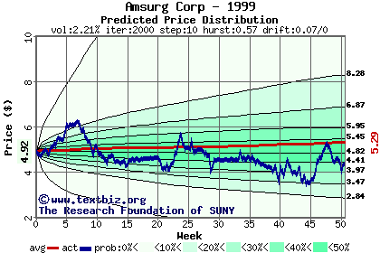 The high to date and low to date prices of the stock plotted against a random walk model for 1999 (what's this?).