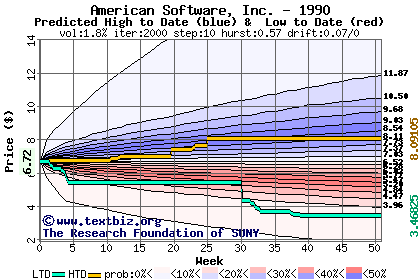 The high to date and low to date prices of the stock plotted against a random walk model for 1990 (what's this?).
