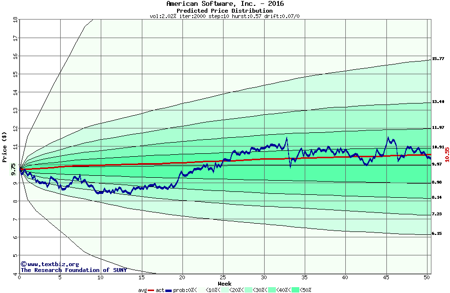 The following graph plots the year-to-date performance of the stock for 2016 compared to the probability calculated by a random walk model.