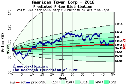 The high to date and low to date prices of the stock plotted against a random walk model for 2016 (what's this?).