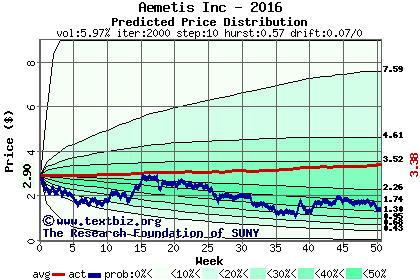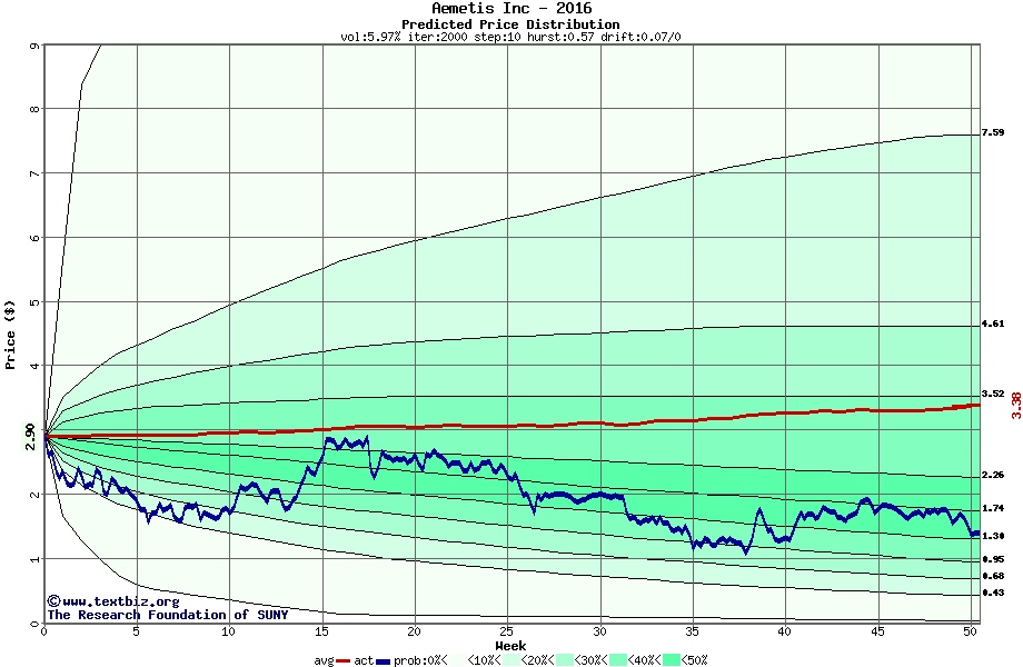 The high to date and low to date prices of the stock plotted against a random walk model for 2016 (what's this?).