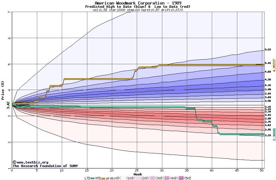 The high to date and low to date prices of the stock plotted against a random walk model for 1989 (what's this?).