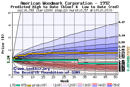 The high to date and low to date prices of the stock plotted against a random walk model for 1992 (what's this?).