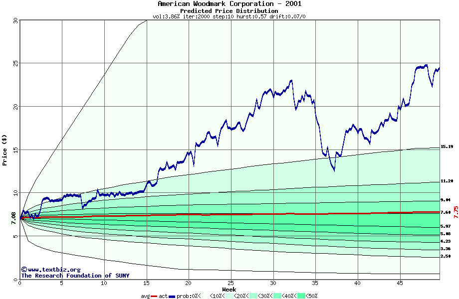 The following graph plots the year-to-date performance of the stock for 2001 compared to the probability calculated by a random walk model.