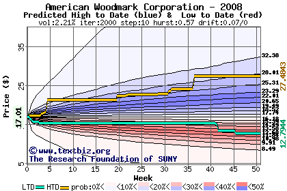 The high to date and low to date prices of the stock plotted against a random walk model for 2008 (what's this?).