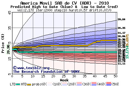 The high to date and low to date prices of the stock plotted against a random walk model for 2010 (what's this?).