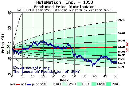 The high to date and low to date prices of the stock plotted against a random walk model for 1998 (what's this?).