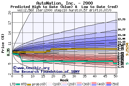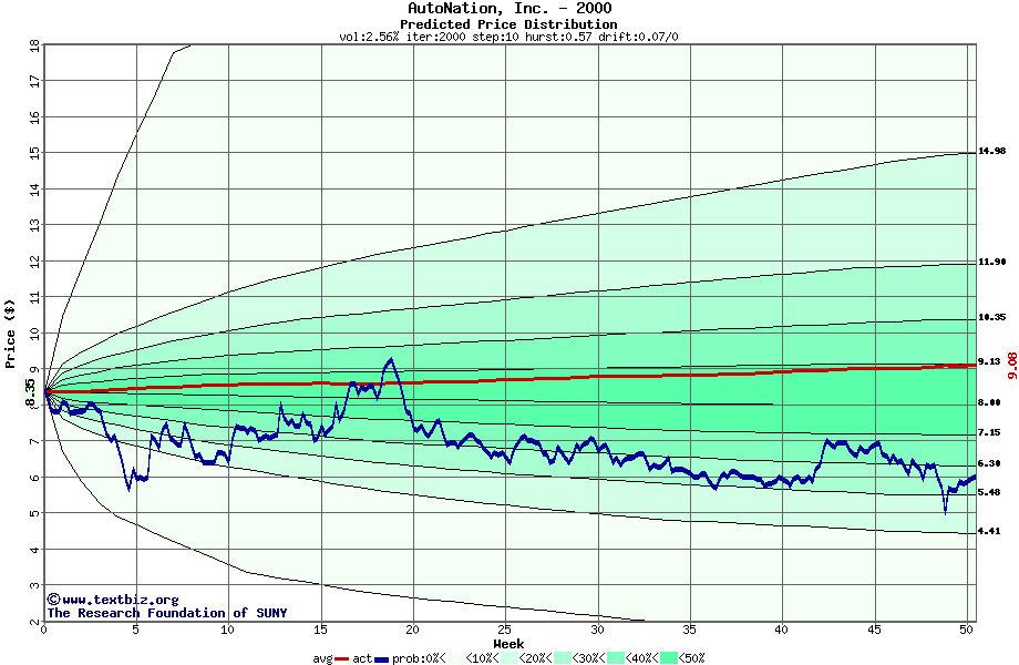 The high to date and low to date prices of the stock plotted against a random walk model for 2000 (what's this?).